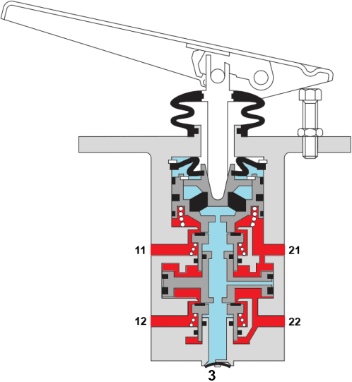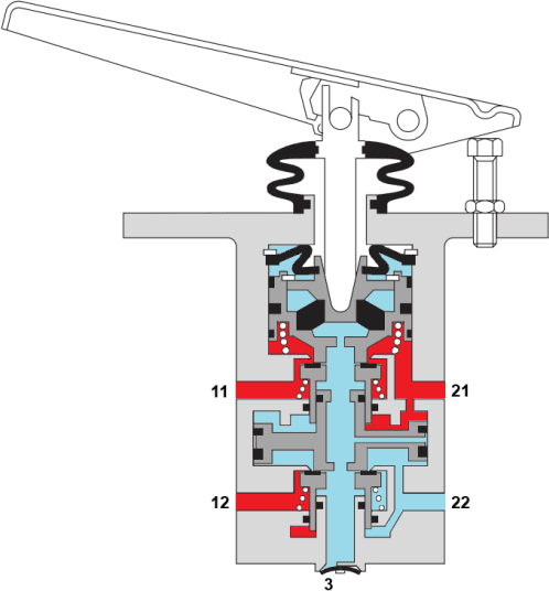 The driver operates the brake pedal (1) with the foot. The operating piston (2) is thereby actuated mechanically and moves downward. The spring plate (3) and the piston sleeves (4 and 6) are also moved downward. A passage is created between inlet 11 and chamber 5. Because the piston sleeves are round, the air flows around them to outlet 21. In this way, pressure is initially built up in brake circuit 1. The reason that the pressure to the rear axle rises a few tenths of a second faster than the pressure to the front axle is that there are usually more valves in the circuit to the rear axle. By actuating these valves a little earlier, the brakes on the front and rear axle will still start braking at the same time.