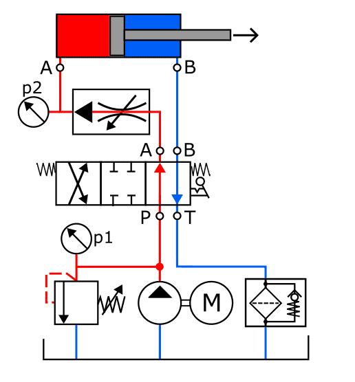 The pressure that can be read from p1 depends on the relief valve, which returns a portion of the hydropump output to the return line. The pressure p2 is determined by the load on the piston: when it experiences more counterforce during the outgoing stroke, the pressure p2 increases.
