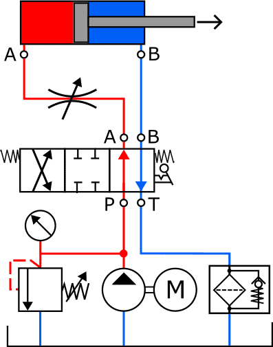 - the throttle with a spring-loaded check valve ensures that the outgoing movement of the piston is slowed. However, during the incoming movement, the fluid flow pushes the check valve open, allowing the fluid to flow back to the return line through both the throttle and the check valve. The outgoing stroke is therefore slower than the incoming stroke;