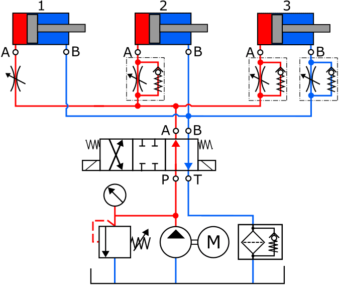 A hydraulic cylinder can primarily be equipped with a flow-control throttle in three ways. The image below shows an electrically operated control valve and three cylinders. Each cylinder has a different throttle control: