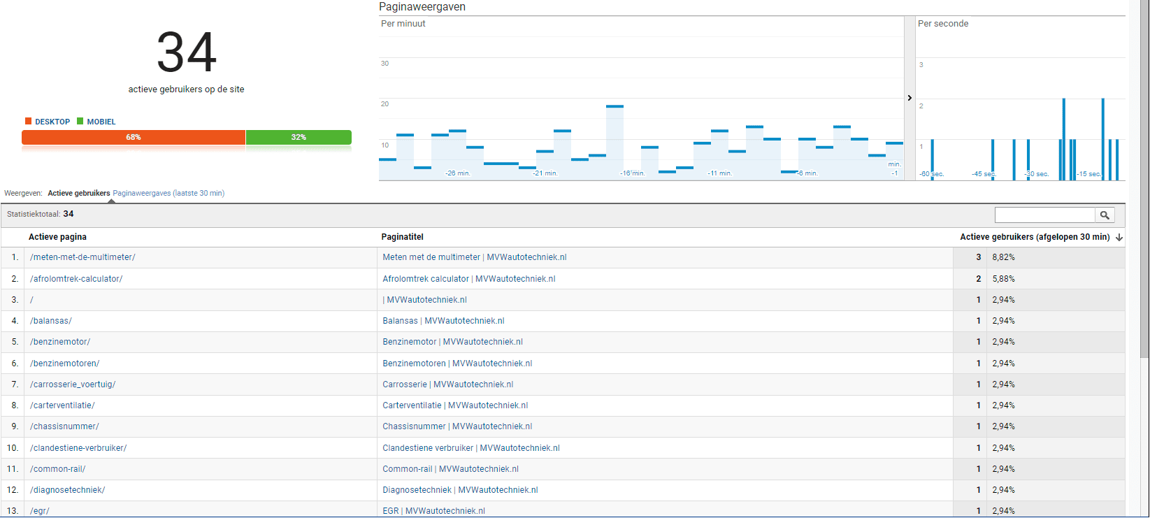 On weekdays, there are often between 20 and 40 active users on the website at any given time. With the aid of “real-time” statistics in Google Analytics, I can see which pages are open in browsers at that moment. The image below shows the number of active users on Tuesday morning, October 5, at 10:30 AM.