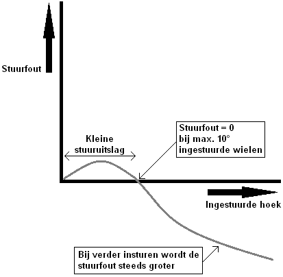 Upon reviewing the mentioned pages, it will be clear that the left front wheel and the right front wheel each have a different steering angle. Thus, a steering error almost always occurs. The steering error means that the two steered angles are not equal to each other, and therefore one wheel has more slip than the other. There is only one situation where no steering error occurs. This is during steering with a small steering angle, up to approximately 10 degrees (see image).