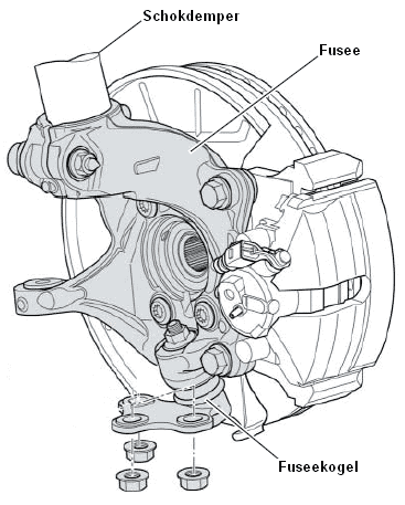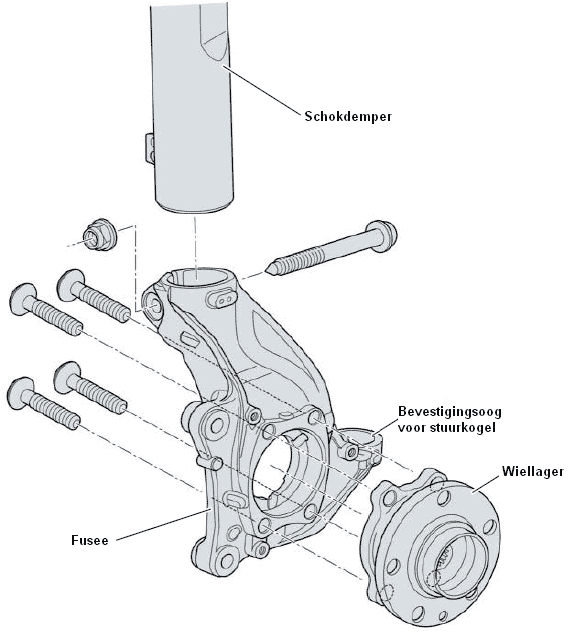 The steering knuckle (also known as knuckle or knuckle body) plays an important role in the wheel suspension. It acts as a pivot point for the ball joint (at the bottom of the knuckle) and the tie rod end. The shock absorber is clamped at the top of the knuckle, allowing it to turn with steering movements. The wheel bearing is also mounted in the knuckle. The image shows part of the wheel suspension with the wheel bearing mounted with 4 bolts, but a wheel bearing can also be pressed into the knuckle. In this case, no bolts are present and special pressing tools are required for assembly or disassembly.