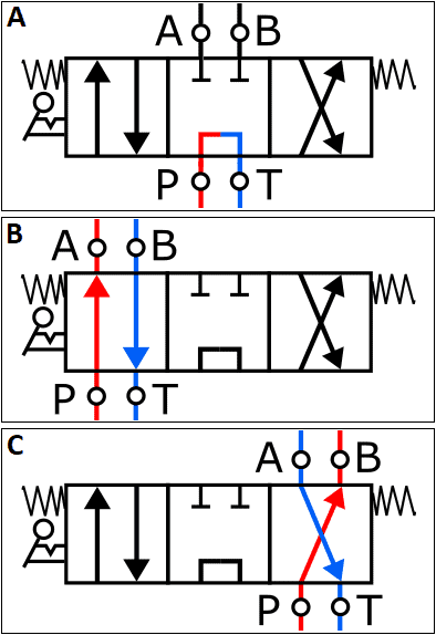 - A: the directional valve is in the neutral position. The hydraulic fluid from the pump is directed straight to the return;