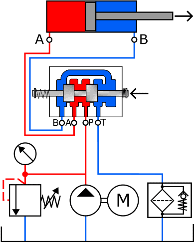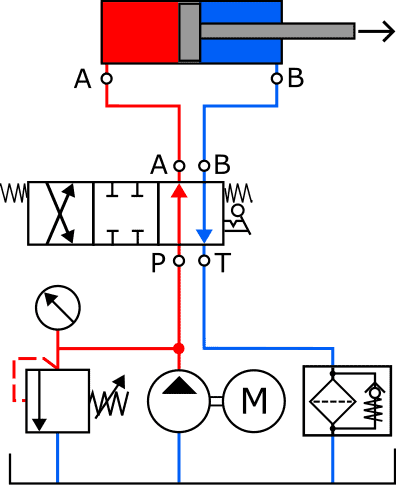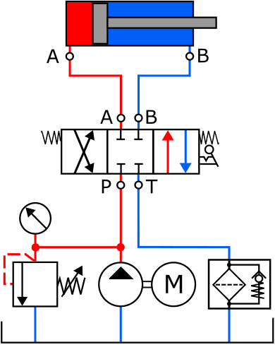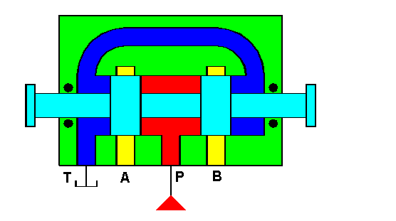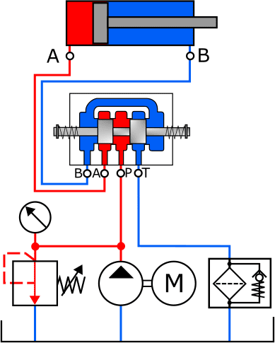 - The return channel is also opened: the fluid can flow to the reservoir via ports B and T.