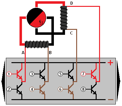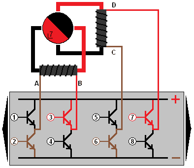 In the image, we see a stepper motor controlled by a control device. Transistors 1 and 4 are brought into conduction. For clarity, the transistors and wires are colored red and brown. Transistor 1 (red) connects terminal A to the positive, and transistor 4 (brown) connects terminal B to ground.