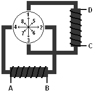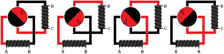 When the rotor is turned to step 5, there is current from A to B in the lower coil and from C to D in the upper coil. There are now two north poles (the red pole shoes) and two south poles (the black pole shoes). The rotor will be in position 5.