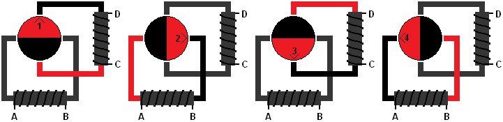 The rotor of the stepper motor can make a full rotation with multiple intermediate steps. In the example in the four images below, four intermediate steps per rotation are shown. The rotor can thus be stopped every 90 degrees. The left stepper motor is in position 1, with the north pole of the rotor at the top and the south pole at the bottom. To move the rotor 90 degrees clockwise, the current from the coil with connections C and D is interrupted, and the other coil is energized. This is seen in the second stepper motor. The left pole shoe turns red (the north pole), and the right turns black (the south pole). As a result, the rotor will be in position 2.