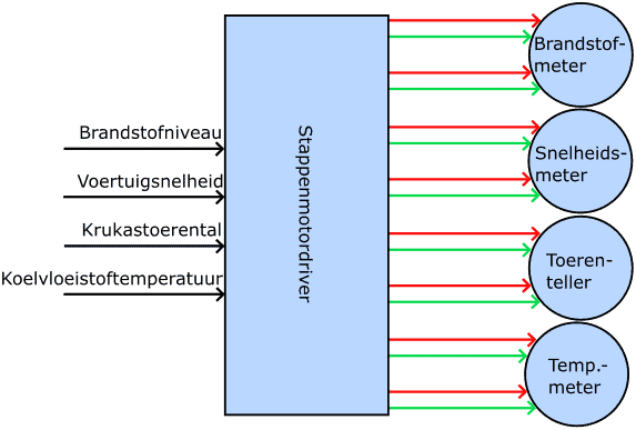 The following diagram shows the inputs and outputs of the stepper motor driver. This is the IC in the instrument cluster that translates incoming information into an output for the stepper motor: