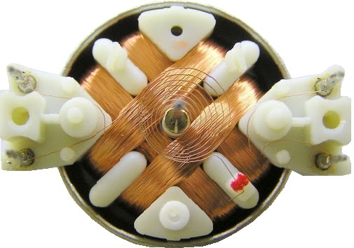 On the back (inside) of the instrument cluster, we find the five stepper motors with black housing. On the right, we see the respective stepper motor without housing. Here the two coils and the four connections (two left, two right) are clearly visible, by which we can recognize the bipolar stepper motor. The stepper motor can adjust the pointer needles in small steps. The command to adjust comes from the ECU in the instrument panel.