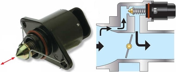 The throttle valve of a gasoline engine is closed when at rest. To allow the engine to idle, a small opening is desired. The passage must also be adjustable because temperature and load (e.g., when consumers such as the air conditioning compressor are engaged) affect the required amount of intake air.