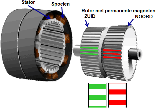 - The red gear is behind the green gear. Because the gears are rotated relative to each other, the red teeth are visible. The north poles on the rotor are attracted by the south poles on the stator.