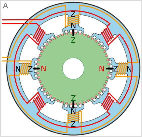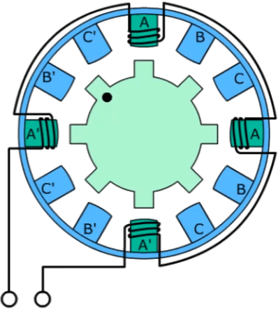 The stator coil on one side (A) is wound opposite to the coil on the other side (A’). The same naturally applies to B and B’, etc. The teeth of the rotor are attracted by the magnetic flux generated by energizing the stator coils.