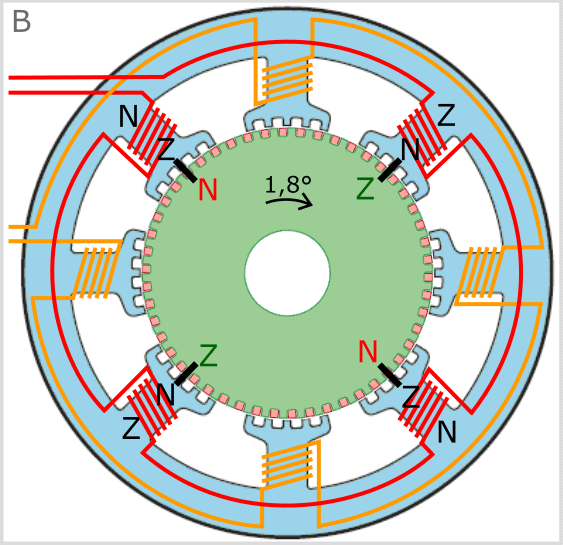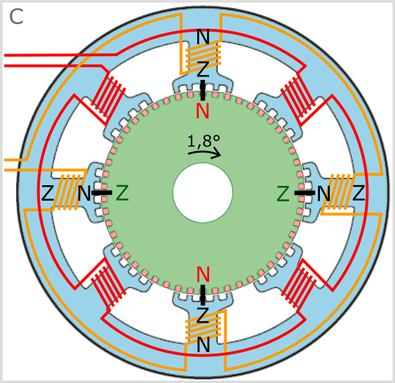 - As a result of switching the magnetic field from the orange to the red coils, the rotor rotates 1.8° clockwise;