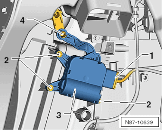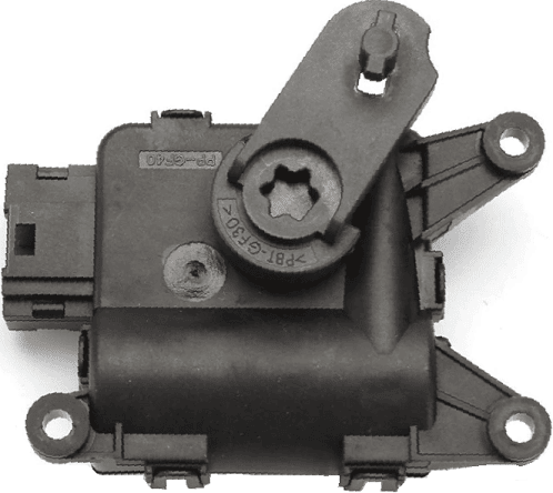 Stepper motors are often found in the electronically controlled air ventilation flaps in the heater housing. The images below show a photo of an air temperature flap (left) and an illustration of the installation position (right). The stepper motor operates the flap through the mechanism, wherein number 4 in the illustration indicates the pivot point. In the event of improper functioning of the stepper motor or after replacement, the start and end positions must be made known to the ECU. With diagnostic equipment, we can program the flap stops so the ECU knows when the flap is fully open or closed, allowing it to determine how long to control the stepper motor to partially open the flap.