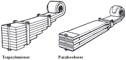 Leaf springs consist of multiple layers mounted on top of each other. The uppermost layer is called the main leaf. The more layers a spring has, the stronger and stiffer it becomes. In the past, they were occasionally mounted on passenger cars. The leaf spring back then usually consisted of a few layers, sometimes just the main leaf. They are still used in commercial vehicles, though these are, of course, much thicker. The middle of the leaf springs is attached to the axle and the ends to the body or chassis. The springing action is achieved by the bending of multiple layers in the middle of the total length.