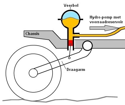 In the sphere, there is compressed gas (represented in the image in blue) that is compressible. The hydraulic fluid (represented in yellow) is not. As the wheel compresses, the red piston is pushed up by the control arm, compressing the gas chamber. The blue space becomes smaller as a result. When the wheel rebounds and the piston moves downward, the system returns to its original state. The springing and damping action is generated by compressing this pressurized gas.