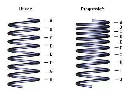 The compliance of a spring is indicated by the spring constant. The spring constant of a linear coil spring is different from that of a progressive coil spring. In a linear spring, the distance between all coils is equal. In a progressive spring, these distances are not equal; the coils will be closer together at the top or bottom of the spring than elsewhere. The difference between these two types of springs is shown in the image: