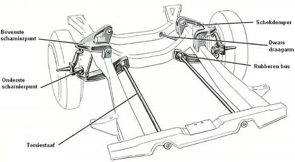Torsion is another word for “twisting”. Torsion suspension was primarily used in the past on American cars. The lower control arm of this design is connected to the body via a torsion bar. When the vehicle compresses, the upper and lower pivot points move. The control arm into which the torsion bar is inserted will want to pivot around the torsion bar. However, that is not possible because the torsion bar has a fixed connection within the control arm. The other end of the torsion bar (in the image at the bottom) is fastened to the body.