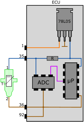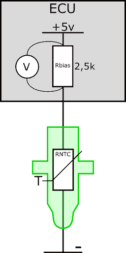 The following image shows a simplified diagram of the ECU and the temperature sensor. The sensor (RNTC) has two wires. The positive wire is connected to the ECU and the negative wire to ground. Inside the ECU, there is a bias resistor. The bias and NTC resistors are connected in series. The ECU supplies the series circuit with a voltage of 5 volts.
