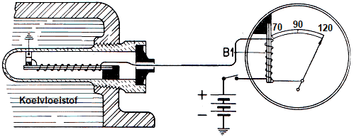 The temperature at which the contact points open depends on the coolant temperature and the current. The average current then depends on the engine temperature. In some cases, the needle points to the maximum position when the ignition is off. The bimetal is then straight.