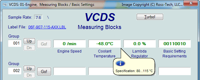 The diagnostic program (in this case, the measured value blocks in VCDS) often also provides a reference value to which the temperature should correspond. In the current operating conditions, the temperature should be between 80 and 115 °C.