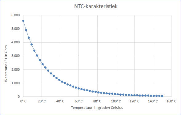 The ratio between resistance and temperature does not have a linear relationship with an NTC resistor. That means that the resistance does not decrease proportionally with the temperature increase. This can be seen in the image as the curved line. This line is called a “characteristic” and follows a logarithmic course.
