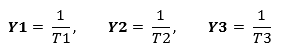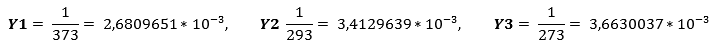 To find the A, B, and C coefficients of the Steinhart-Hart, three resistance values (R1, R2, and R3) at a temperature (T1, T2, and T3) must be determined. These should be looked up in the specifications of the semiconductor or measured with a thermometer and an ohmmeter. L1, L2, and R3 are calculated by determining the inverse of the resistance values. Y1, Y2, and Y3 are determined by calculating the inverse of the temperature in Kelvin.