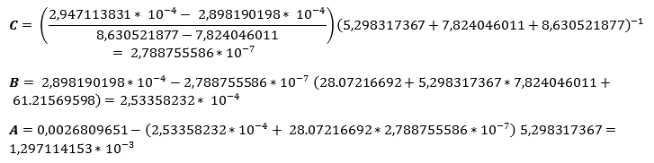 Next, the Steinhart-Hart coefficients (A, B, and C) can be calculated: