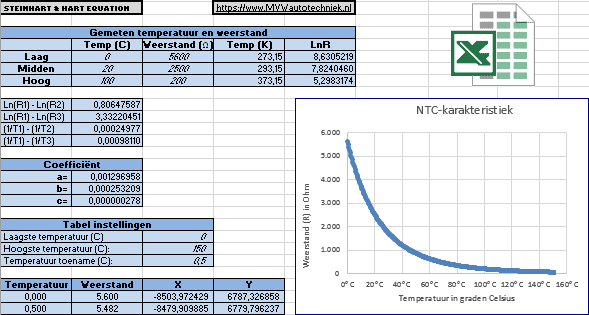 It is interesting to look into this in more detail. With the three measured resistance values, the exact resistance can be determined over an infinitely large temperature range by means of the “Steinhart-Hart equation”. The characteristic can also be determined accurately. At the bottom of this page an Excel file can be downloaded with which the characteristic can be generated.