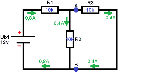 Below is a circuit with 2 voltage sources (Ub1 of 12.6 V and Ub2 of 16.8 V). The voltage UAB must be determined (that is, the voltage at the blue dots). In the following steps the voltages across the resistors and the currents throughout the circuit are calculated. Based on that, the voltage across A and B can again be calculated.