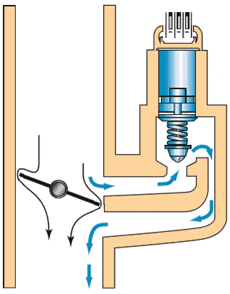 A bypass valve opens or closes the air supply outside of the throttle valve to stabilize idle speed. In the image below, a partially opened throttle valve is shown on the left. On the right side, an open bypass valve allows air to be drawn into the bypass channel through the engine. When the throttle valve opens further, the bypass valve will close. The bypass is only necessary when the throttle valve is closed. The engine management system determines how far the bypass valve must open. The throttle position sensor, indicating the opening angle of the throttle valve, provides the necessary information along with the air temperature sensor.