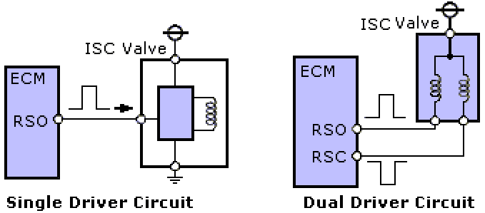 The duty cycle control can be measured with an oscilloscope. In the image below, the valve is half open (duty cycle 50%). On ISC1 and ISC2, the positive and negative pulses are equal.