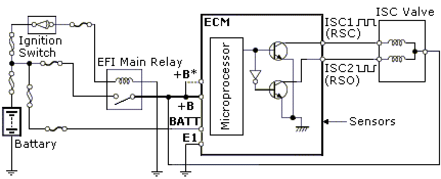 The diagram below shows the control method for the two coils. When the “EFI Main Relay” (relay for the engine management computer) is activated, the microprocessor is powered. Two transistors in the ECU are controlled.