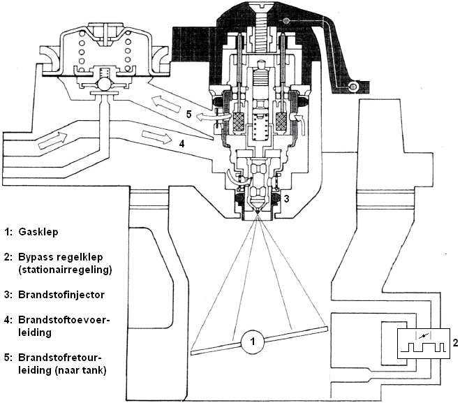 In engines with single-point injection (monopoint injection system), one injector is mounted on the throttle valve. This injector sprays fuel directly onto the throttle valve. This technology is old and is no longer used in new cars because of several disadvantages. As the injector sprays onto the throttle valve, the fuel mixes with the air there. The intake manifold is divided over four or more cylinders. The amount of fuel may not be exactly the same in all cylinders. For instance, cylinder 1 receives the most fuel in the air supply, while cylinder 4 receives much less. This makes the system unmanageable or hardly manageable. Thus, the application of monopoint is unsuitable to meet current environmental requirements.