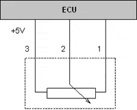In the following diagram, we see an ECU and a potentiometer connected by three wires. The potentiometer has a mechanical connection to the throttle valve. A rotation of the throttle valve will result in a shift of the slider.