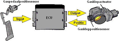 Today, throttle valves are electronically controlled: there is no (mechanical) cable between the accelerator pedal and the throttle valve. The position of the accelerator pedal is recorded by two position sensors and sent to the ECU of the engine management system. The ECU checks the plausibility of the signals by comparing them and controls the throttle actuator (actuator motor) to set the valve to a pre-determined position. This is referred to as “throttle by wire”, in Dutch: throttle control via wiring.