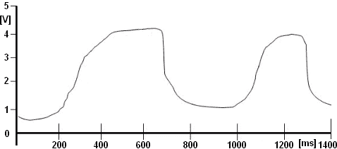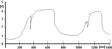 With a multimeter, you can measure the supply voltage relative to the ground. This should be a stabilized voltage of 5.0 volts. The signal voltage is better measured with an oscilloscope: disturbances can appear in the AM signal that are not visible with a multimeter measurement. The two drawings below show a correct signal (smooth lines) and a signal with interference, where the signal exhibits a significant voltage drop within a very short time frame.