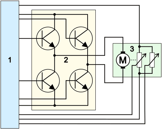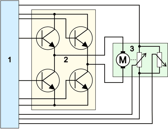 On the H-bridge page, the control methods of the electric motor are described. On the Potentiometer page, there is a detailed explanation of the operation and measurement of the position sensor.