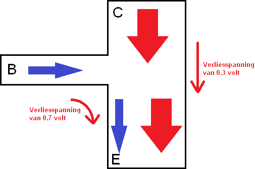 In the illustration, the base is on the left, the collector is above, and the Emitter is below. When a base current flows (blue arrow), it finds its way to the Emitter. This also causes a collector current to flow to the Emitter. As soon as the base current stops, the current from collector to Emitter also stops.