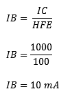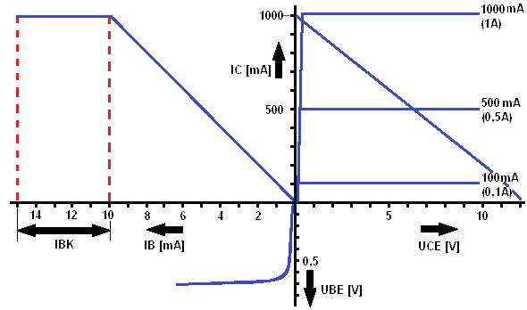 In these characteristics, it can be seen that the IB (current on the base) increases to 10mA. This part, from 0 to 10 mA, is calculated with the formula: IB = IC : HFE. Then the line runs completely horizontal from 10 to 15mA. This part is the amplification factor of 1.5 (from the calculation of IB = 1.5 x IBK). At a base current of 15mA, there is a collector current (IC) of 1000mA.