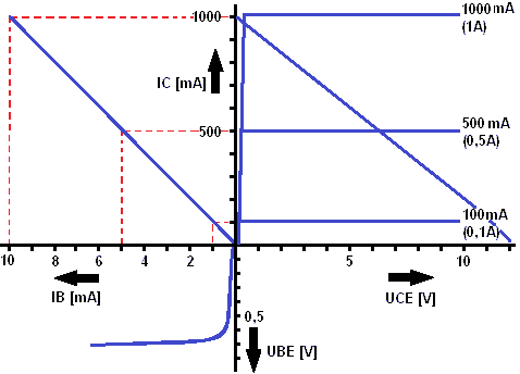 Here, the relationship between UB and IC is indicated. IC = HFE x IB, with HFE= 10 in these characteristics, so IC is 10 times as large as IB. The safety factor of IB = 1.5 x IBK has not yet been included here.