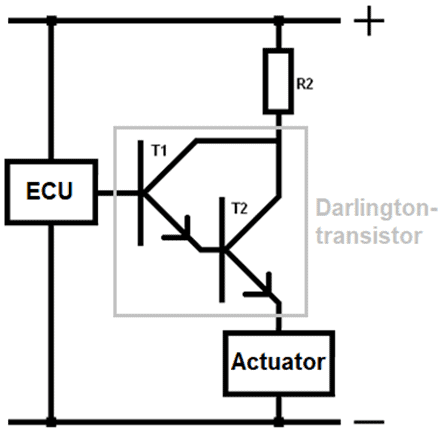 By means of a Darlington transistor, a large current can be switched to the actuator with a small control current from the ECU.