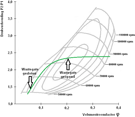 At the start of the line, the wastegate is closed. This causes all exhaust gas to flow through the turbine wheel and boost pressure rises. As the desired boost pressure is reached, the engine management system partially opens the wastegate to route part of the exhaust gases around the turbine and prevent boost pressure from increasing further. The turbo shaft speed in this operating region is between about 80,000 and 90,000 revolutions per minute, as can be read from the speed lines in the compressor map.