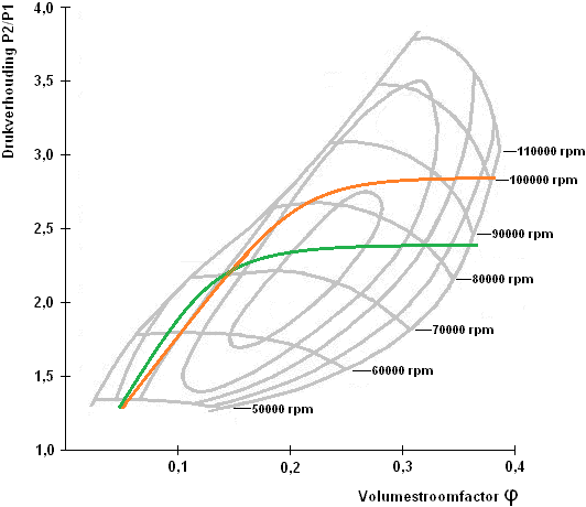 Each line indicates a constant speed of the compressor wheel, for example 50,000 rpm, 70,000 rpm, or 100,000 rpm. At a given speed, such a line shows which combinations of volume flow and pressure ratio are possible.