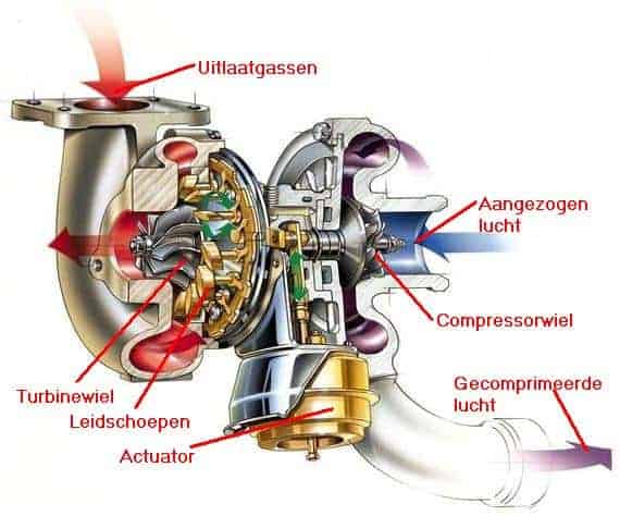 On virtually every turbo without variable vanes, a wastegate is installed. The wastegate ensures that the pressure and speed of the turbo do not become too high. This is done by routing part of the exhaust gases past the turbine wheel, so that these gases do not contribute to driving the turbo. When the turbo still needs to build pressure, for example during acceleration, the wastegate is closed. All exhaust gases that leave the cylinders during the exhaust stroke then flow through the turbine wheel. This allows the turbo to spool up quickly and build the desired boost pressure.