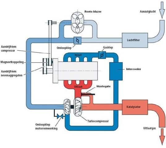 Increasingly, car manufacturers choose to equip an engine with both a turbo and a mechanical supercharger. In this setup, the turbo is often larger and equipped with a wastegate. The supercharger is used to reduce or prevent turbo lag. At low engine speeds, the supercharger provides boost pressure immediately and helps the turbo get going faster. At higher engine speeds, the turbo takes over boost pressure completely and the supercharger is switched off or bypassed.
