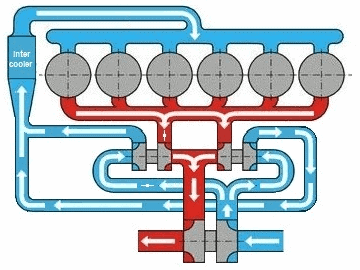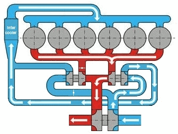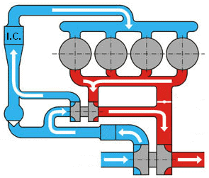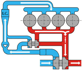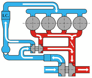 In the four images below, the situations are described in which the turbos both operate, or when only one of the two operates. The four circles are the cylinders; the red and blue parts are the exhaust gases and intake air. The intercooler is indicated with “I.C.”.