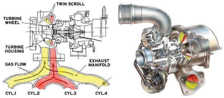 Using a twin-scroll turbo improves the turbo’s response time, because the exhaust gases from cylinders 1 and 4 and from cylinders 2 and 3 are kept separate. This preserves the exhaust-gas pulses better and makes them less affected by negative pressure waves from other cylinders. As a result, the pulses that reach the turbine wheel are stronger and more energetic.