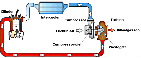 The intercooler cools the compressed intake air before it enters the engine. The intercooler is a separate component and is therefore discussed in detail on a separate page; see the page Intercooler.